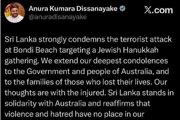 இந்தச் சம்பவம் தொடர்பாக ஒரு எக்ஸ் செய்தியை வெளியிட்ட ஜனாதிபதி, அவுஸ்திரேலிய அரசாங்கத்திற்கும் இறந்தவர்களின் குடும்பத்தினருக்கும் தனது ஆழ்ந்த இரங்கலைத் தெரிவித்தார்.