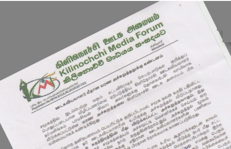 பொதுப்படையான விழிப்புணர்வை ஏற்படுத்திய கிளிநொச்சி ஊடகவியலாளர் தர்மலிங்கம் பரமசிவன் (சிவா) அவர்களுக்கு தொலைபேசி வாயிலாக விடுக்கப்பட்டுள்ள மரண அச்சுறுத்தல் என்பது சட்டவிரோத செயற்பாடுகளுக்கு எதிரான ஊடகவியலாளர்களின் பணியை முடக்குவதற்கே என தெரிவித்துள்ள கிளிநொச்சி ஊடக அமையம் இதனை மிக வன்மையாகக் கண்டிப்பதாகவும் தெரிவித்து அறிக்கை ஒன்றை விடுத்துள்ளது.
