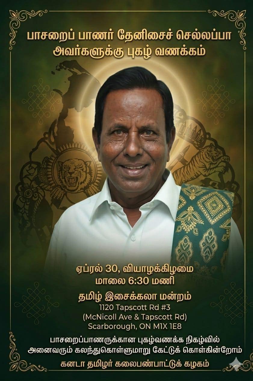 பாசறைப் பாணர் தேனிசைச் செல்லப்பா அவர்களுக்கான புகழ் வணக்க நிகழ்வொன்றை நாளை 30ஆம் திகதி வியாழக்கிழமை கனடா தமிழர் கலைபண்பாட்டுக் கழகம் நடாத்தவுள்ளது. ஸ்காபறோவில் அமைந்ததுள்ள