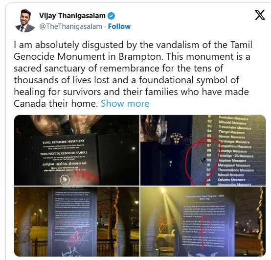 பிரம்ப்டனில் உள்ள தமிழ் இனப்படுகொலை நினைவிடம் சேதப்படுத்தப்பட்டதைக் கண்டு நான் மிகவும் மனம் வருந்துகின்றேன் என்று ஒன்டாரியோ மாகாண நாடாளுமன்ற உறுப்பினர் விஜய் தணிகாசலம் தனது சமூக வலைத்தளத்தில் பதிவிட்டுள்ளார்.