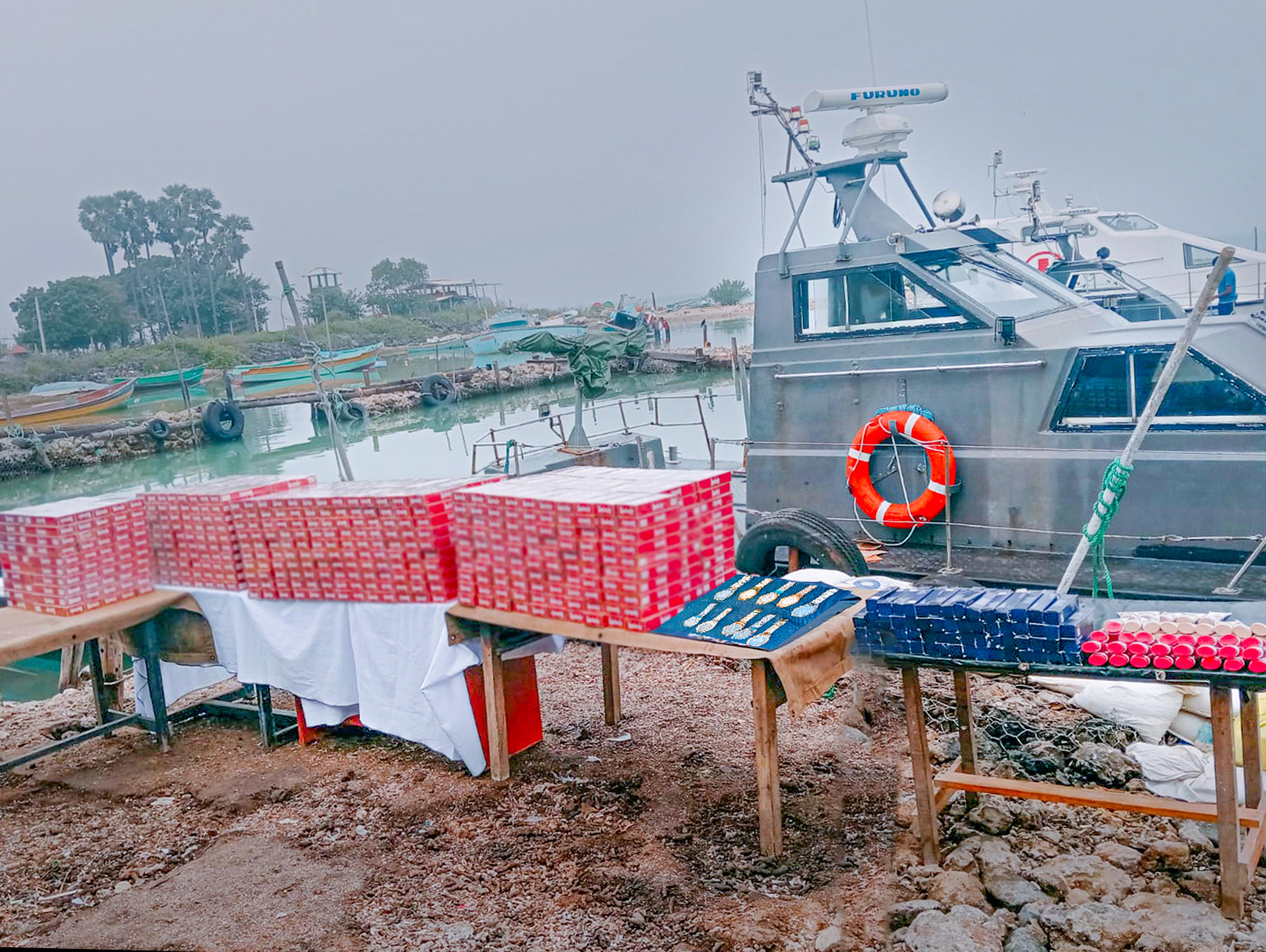 யாழ்ப்பாணம், நெடுந்தீவுக்கு தெற்கே உள்ள கடல் பகுதியில் 2025 டிசம்பர் 03 ஆம் திகதி இலங்கை கடற்படை நடத்திய சிறப்பு தேடுதல் நடவடிக்கையின் மூலம், சட்டவிரோதமாக நாட்டிற்கு கொண்டு வர முயன்ற சுமார் ஒரு லட்சத்து அறுபதாயிரம் (160,000) வெளிநாட்டு சிகரெட்டுகள், அழகுசாதனப் பொருட்கள் மற்றும் கைக்கடிகாரங்கள் ஆகியவை கைப்பற்றப்பட்டன.