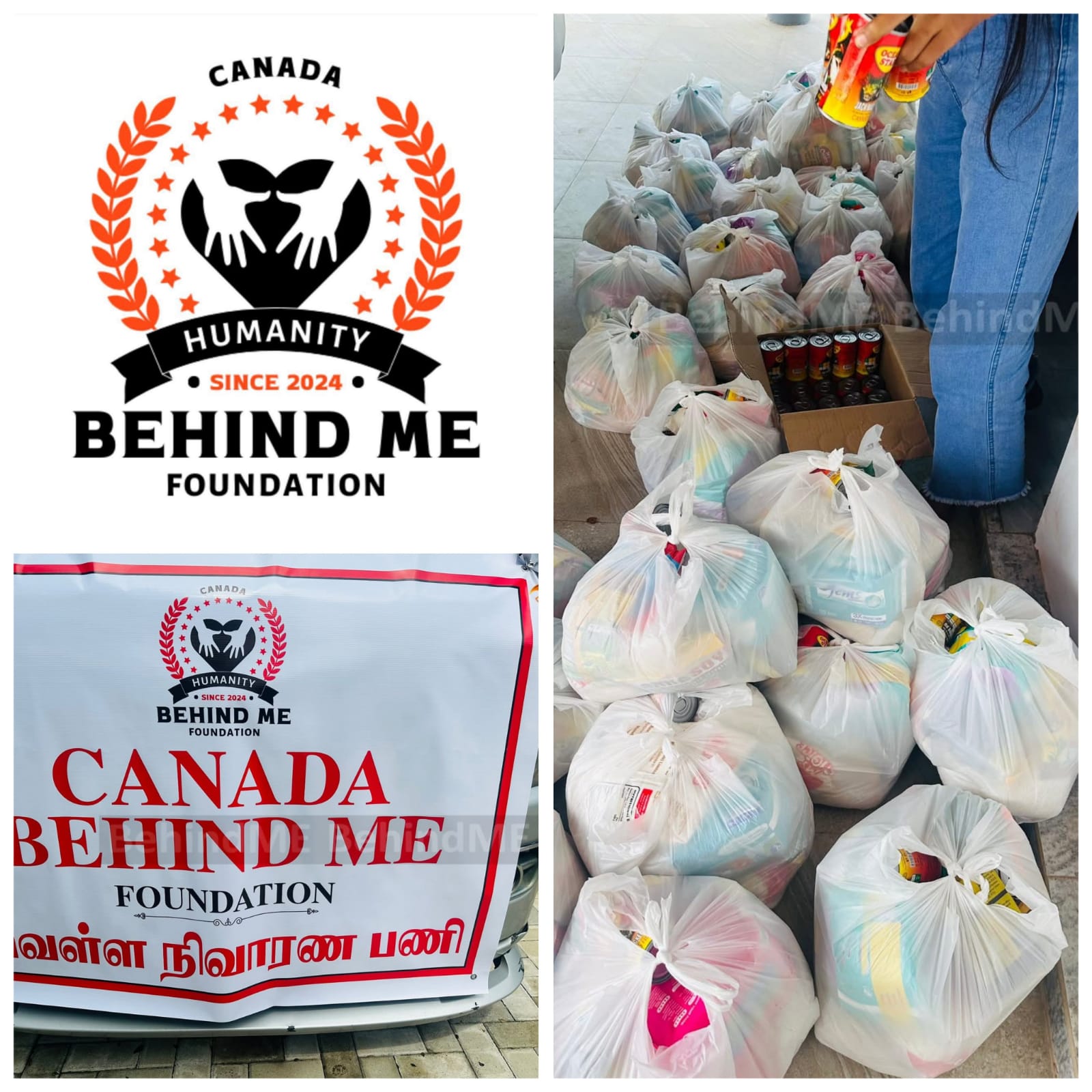 இலங்கையில் ஏற்பட்ட தித்வா புயல் பேரிடர் காரணமாகப் பாதிக்கப்பட்ட வடக்கு மற்றும் கிழக்கு மக்களுக்கு Behindme Foundation உதவிகளை மேற்கொண்டு வருகின்றது. அது மாத்திரமன்றி அடுத்த ஓரிரண்டு நாட்களுக்கான அத்தியாவசிய தேவைகளான குடிநீர், உலர் உணவுப் பொருட்கள், மருந்துகள், பெண்களுக்கான அடிப்படைத் தேவைகள் குழந்தைகளுக்கான டயப்பேர்ஸ் ஆகியவற்றை வழங்கிக் கொண்டிருக்கின்றது. இலங்கையிலிருந்தோ அல்லது கனடாவிலிருந்தோ உதவ விரும்புபவர்கள் திரையில் காணப்படும் இலக்கங்கள் வாயிலாக தொடர்பு கொள்ளுமாறு கேட்டுக்கொள்கின்றோம்.