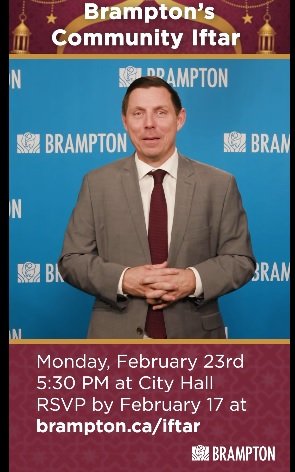 எதிர்வரும் பெப்ரவரி 23 ஆம் திகதியன்று பிராம்ப்டனின் இஃப்தார் நிகழ்ச்சி பிராம்ப்டனின் நகர மண்டபத்தில் நடைபெறவுள்ளதாக பிராம்ப்டனின் நகராட்சி தனது சமூக வலைத்தளத்தில் தகவல் தெரிவித்துள்ளது.