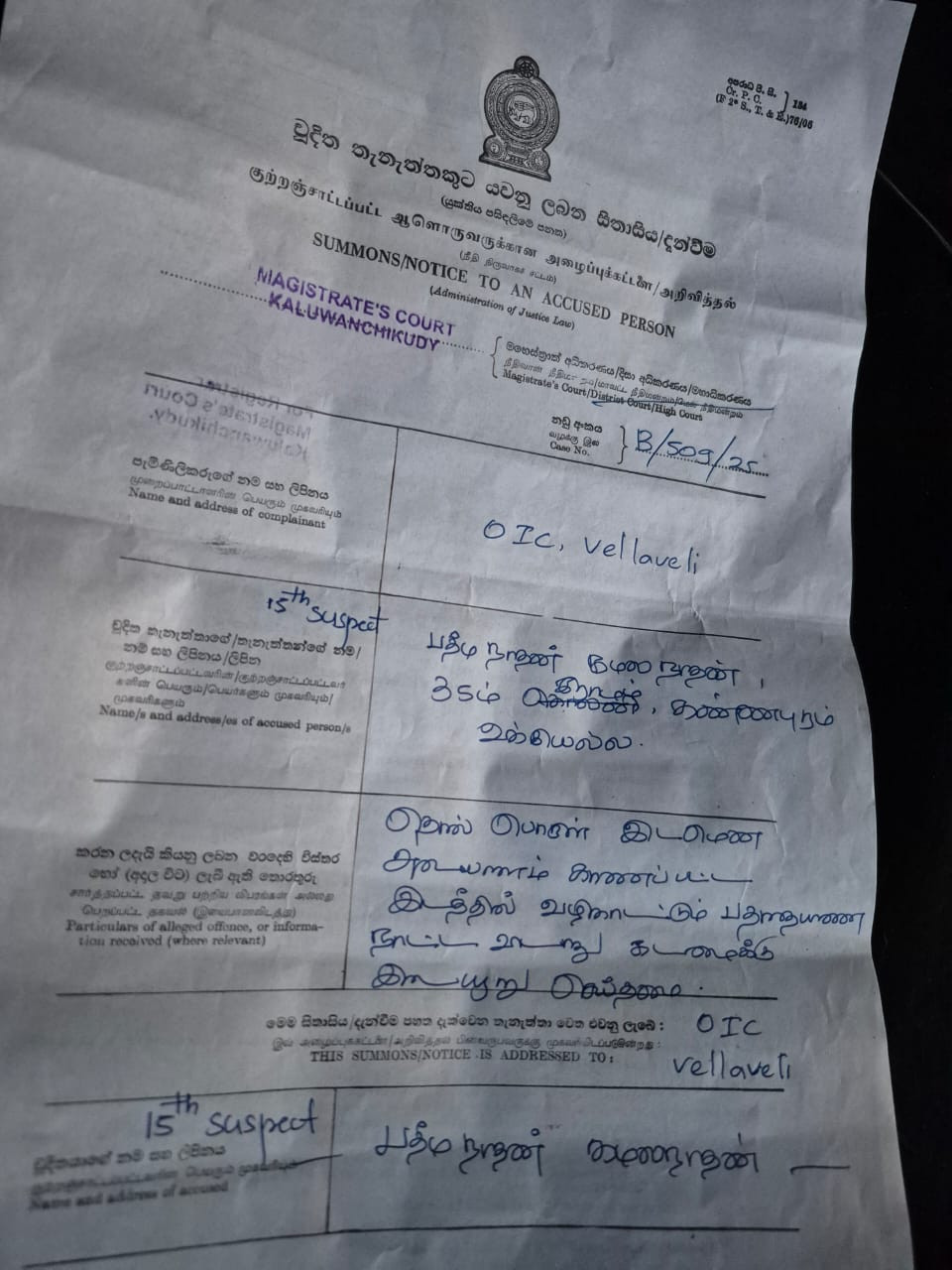 இதில் ஒருவர் அண்மையில் நடந்த கத்திக்குத்து சம்பவத்தில் உயிரிழந்திருந்த நிலையில் அவருக்கும் அழைப்பாணை அனுப்பப்பட்டுள்ளது.அத்துடன் ஒரு குடும்பத்தில் பலருக்கு இவ்வாறு அழைப்பானை அனுப்பிவைக்கப்பட்டுள்ளதாக அப்பிரதேச மக்கள் தெரிவித்தனர்.