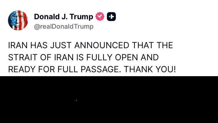 “ஈரான் கடற்பாதை (Strait of Iran) முழுமையாகத் திறக்கப்பட்டுள்ளதாகவும், முழுமையான போக்குவரத்திற்குத் தயாராக இருப்பதாகவும் ஈரான் தற்போது அறிவித்துள்ளது. மிக்க நன்றி!” எனக் குறிப்பிட்டுள்ளார்.