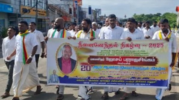 மட்டக்களப்பில் தேவாலயத்தில் வைத்து படுகொலை செய்யப்பட்ட தமிழ் தேசிய கூட்டமைப்பின் முன்னாள் நாடாளுமன்ற உறுப்பினர் ஜோசப் பரராஜசிங்கம் 20 ஆம் ஆண்டு நினைவேந்தலையிட்டு இன்று வியாழக்கிழமை (25) மட்டக்களப்பு காந்தி பூங்காவில் இருந்து மாநகரசபை மண்டபம் வரை படுகொலைக்கு நீதி வேண்டி ஆர்பாட்டம் இடம்பெற்றது. இதில் தமிழரசு கட்சி நாடாளுமன்ற உறுப்பினர்கள் மற்றும் மாநகரசபை முதல்வர் பிரதேச சபை தவிசாளர்கள் உறுப்பினர்கள் கட்சி ஆதரவாளர்கள் பொதுமக்கள் கலந்து கொண்டனர்.