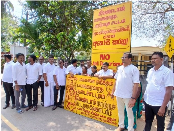 அரசினால் புதிதாக முன்வைக்கப்பட்டுள்ள அரசைப் பாதுகாக்ககும் பயங்கரவாதத் தடைச்சட்டம் மற்றும் நடைமுறையில் உள்ள பயங்கரவாதத் தடைச்சட்டம் என சகல அடக்குமுறைச்சட்டங்களையும் உடனே அரசாங்கம் மீளப் பெறவேண்டும் என வலியுறுத்தி புத்தூரில் கறுப்புப் பதாகை ஆர்ப்பாட்டம் மற்றும் எதிர்ப்புப் பதாகைகளை வீதியில் காட்சிப்படுத்தி போராட்டம் முன்னெடுக்கப்பட்டுள்ளது. வியாழக்கிழமை (26) நண்பகல் புத்தார் பிரதேச சபையின் முன்பாக தவிசாளர் தியாகராஜா நிரோஸ் தலைமையில் ஒன்று கூடிய பிரதேச சபையின் உறுப்பினர்கள் அரசு நடைமுறையில் உள்ள பயங்கரவாதத் தடைச்சட்டத்தினையும் நீக்கவேண்டும் என […]