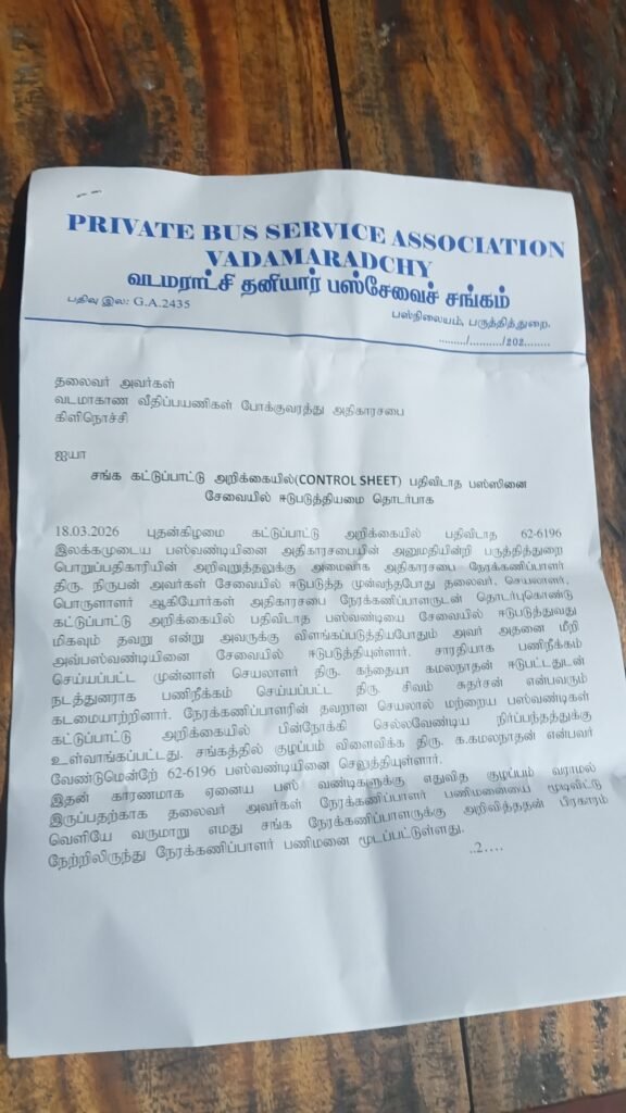 வடமராட்சி தனியார் பஸ் சேவைச் சங்கம் வடமாகாண வீதி பயணிகள் போக்குவரத்து அதிகார சபை தலைவருக்கு கடிதம் ஒன்றினை நேற்று அனுப்பி வைத்துள்ளது. வடமராட்சி தனியார் பஸ் சேவை சங்கத்தின் விதிமுறைகளை மீறிய சிற்றூர்தி நடத்துனர் மற்றும் சாரதி ஒருவரையும் ஏற்கனவே ஒழுக்காற்று நடவடிக்கை காரணமாக சங்கத்தால் இடை நிறுத்தப் பட்டிருந்ததாகவும், அதே வேளை சங்க கட்டுப்பாட்டு அறிக்கையில் பதிவிடாத சிற்றூர்தி ஒன்றில் பயணிகளை ஏற்றி செல்ல வடமராட்சியில் அமைந்துள்ள வட மாகாண வீதி பயணிகள் போக்கு […]