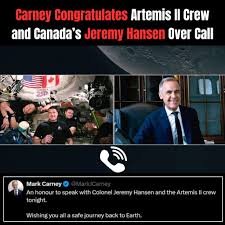 ஆர்ட்டெமிஸ் II (Artemis II) விண்வெளி வீரர்களுக்குப் பிரதமர் மார்க் கார்னி (Mark Carney) தனது வாழ்த்துகளை ட்விட்டர் (X) வாயிலாகத் தெரிவித்துள்ளார். “ஆர்ட்டெமிஸ் II குழுவினர் பூமிக்குத் திரும்பியுள்ளனர். இந்த வரலாற்றுச் சாதனையைப் படைத்த கர்னல் ஹேன்சன் (Colonel Hansen) மற்றும் குழுவினருக்கு எனது வாழ்த்துகள். தாய்நாட்டிற்கு அன்புடன் வரவேற்கிறோம்.”என தெரிவித்துள்ளார் குறிப்பு: ஆர்ட்டெமிஸ் II விண்கலத்தில் பயணித்த நான்கு வீரர்களில் ஒருவரான ஜெர்மி ஹேன்சன் (Jeremy Hansen) கனடா நாட்டைச் சேர்ந்தவர் என்பது குறிப்பிடத்தக்கது
